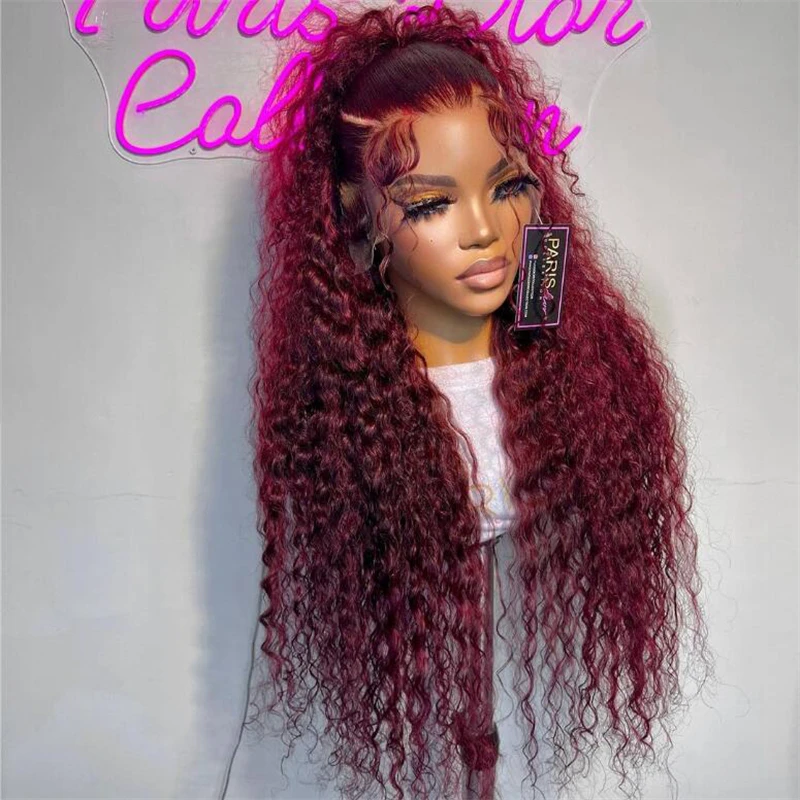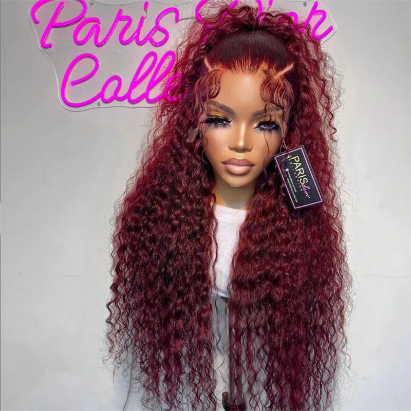 Glueless 26Inch Soft Long Burgundy Kinky Curly Lace Front Wig For Women With Baby Hair Synthetic Preplucked Daily